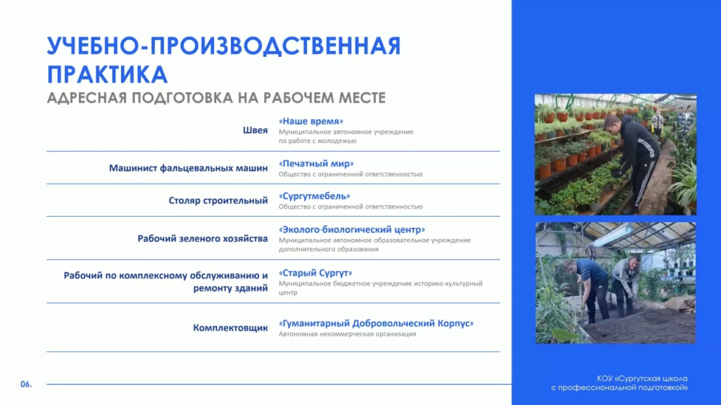 Свое выступление Валентина Александровна завершила видеороликом о молодых гражданах с инвалидностью, трудоустроенных в различные организации, их благодарность Сургутской школе профессиональной подготовкой для обучающихся с ограниченными возможностями здоровья. - Меры поддержки в сфере занятости для молодых инвалидов.