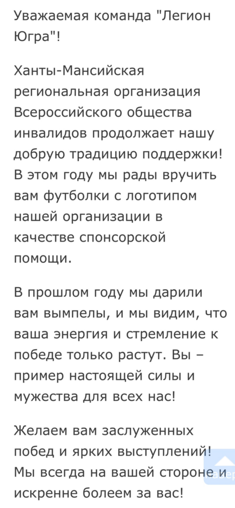 Продолжая Эстафету добрых дел, посвященную Великой Победе и в связи с 95-летием Ханты-Мансийского автономного округа-Югры, подарили команде «Легион Югра» футболки, с логотипом округа и ХМАО ВОИ.