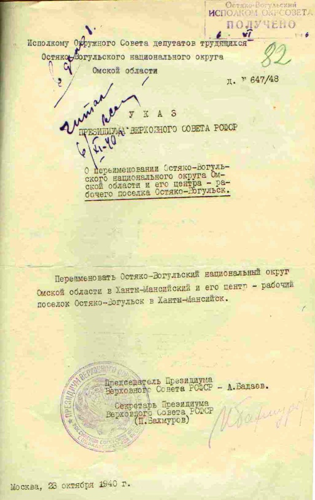 85 лет назад, 23 октября 1940 года Указом Президиума Верховного Совета РСФСР Остяко-Вогульский национальный округ Омской области переименован в Ханты-Мансийский и его центр - рабочий поселок Остяко-Вогульск в Ханты-Мансийск