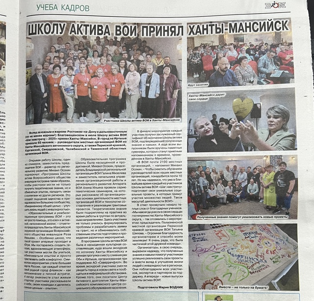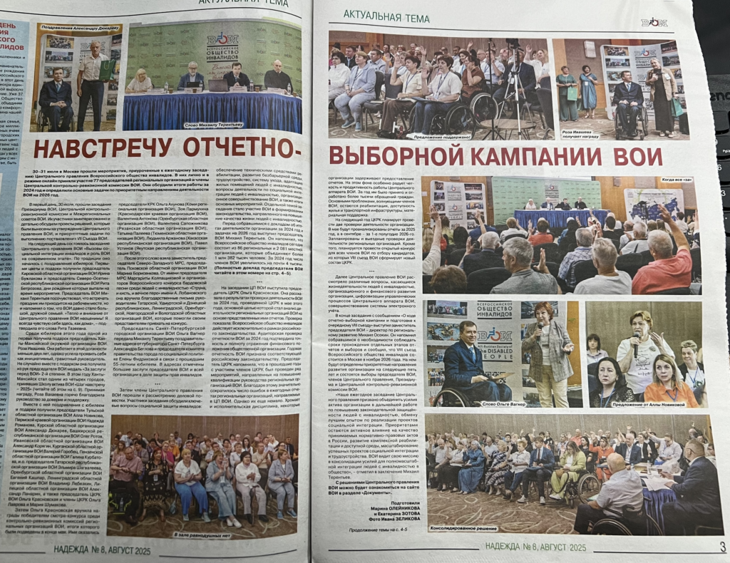 Всероссийская газета «Надежда» № 8 за август 2025 года на своей странице опубликовала статью о заседании Правления Всероссийского общества инвалидов, в Москве с 29 июля по 1 августа 2025 года, где есть фото награждения председателя ХМАО ВОИ Розы Ивашевой и статья о Школе Актива, которая прошла с 14 по 17 июля 2025 года, в городе Ханты-Мансийске, где принимали участие представители региональных обществ инвалидов Тюмени, Перми, Кургана, Челябинска, Свердловска и Москвы.