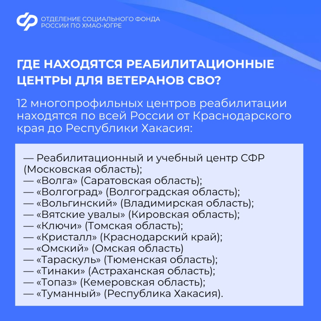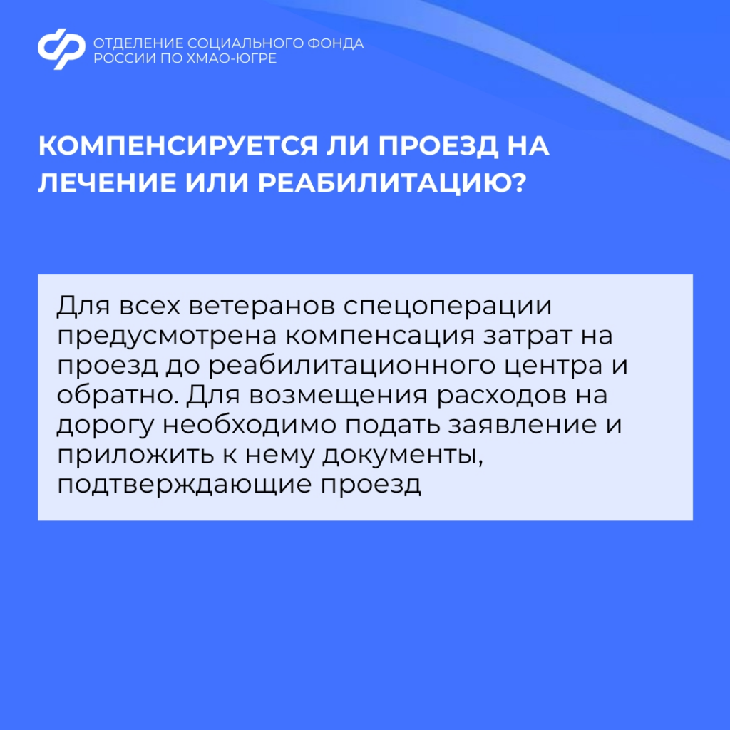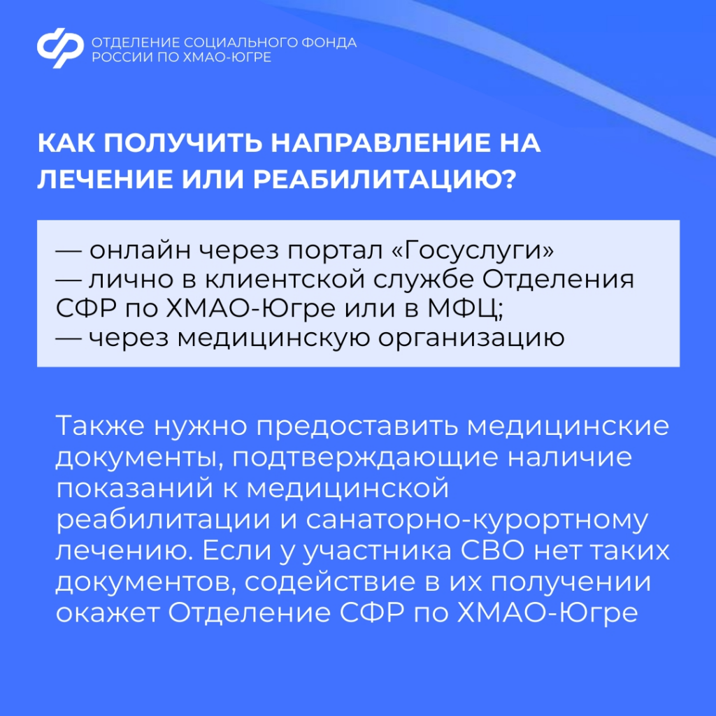 Отделение СФР по ХМАО-Югре обеспечивает индивидуальное сопровождение ветеранов СВО на протяжении всего процесса: с момента подачи заявления, пока находятся на лечении и до возвращения домой.