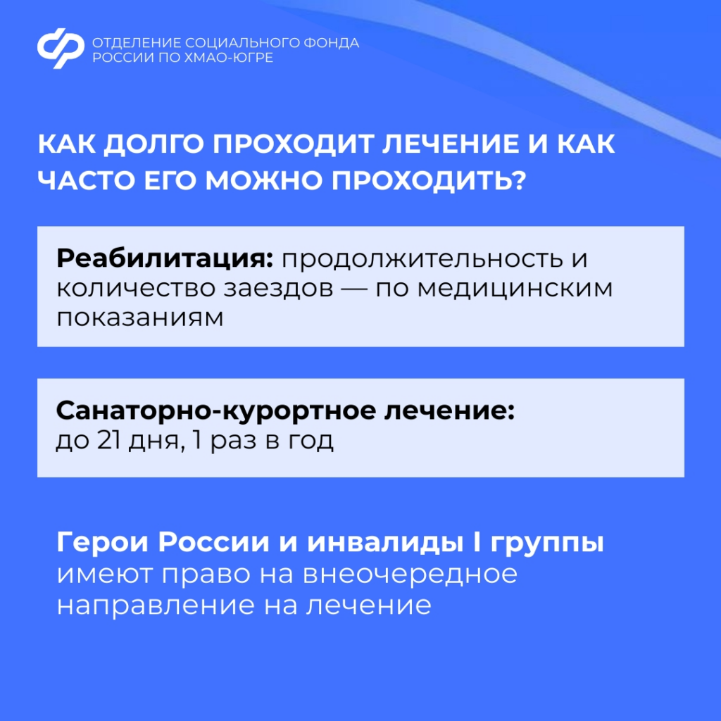 Решение о направлении на санаторно-курортное лечение или медицинскую реабилитацию принимается в течение двух рабочих дней после подачи заявления. В течение дня после этого Отделение СФР по ХМАО-Югре сообщает ветерану о результатах.