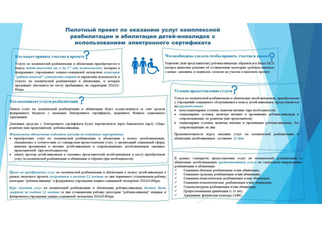 Памятки о реализации электронного сертификата на оказание услуг по комплексной реабилитации и абилитации детей-инвалидов и о возможности реализации права на бесплатный проезд или компенсацию к месту приобретения услуги по комплексной реабилитации и абилитации и обратно, о реализации в автономном округе пилотного проекта по оказанию услуг по комплексной реабилитации и абилитации детей-инвалидов и возможности участия в нем ребенка-инвалида.