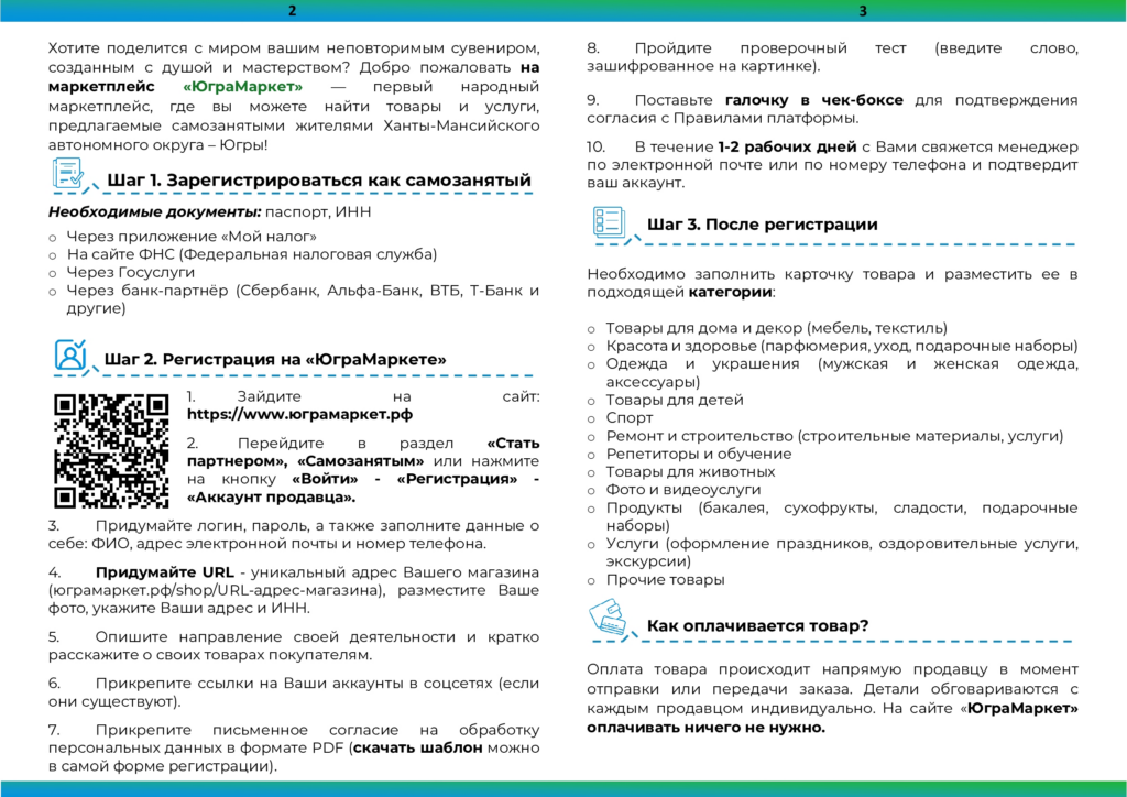 Доводим до сведения самозанятых инвалидов и пожилых граждан о возможностях реализации собственноручно изготовленной продукции посредством социального маркетплейса автономного округа «ЮграМаркет», направляем информационные памятки (Приложения 1, 2,)